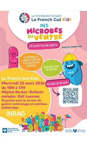 Le French Gut Kids viendra à Necker et tiendra un stand sur les microbes du ventre le 25 mars de 10h à 17h. Organisé avec le service de gastro-entérologie et nutrition pédiatrique de l'hôpital, cet événement est à destination de tous les enfants de l'hôpital, leur famille et les professionnels.